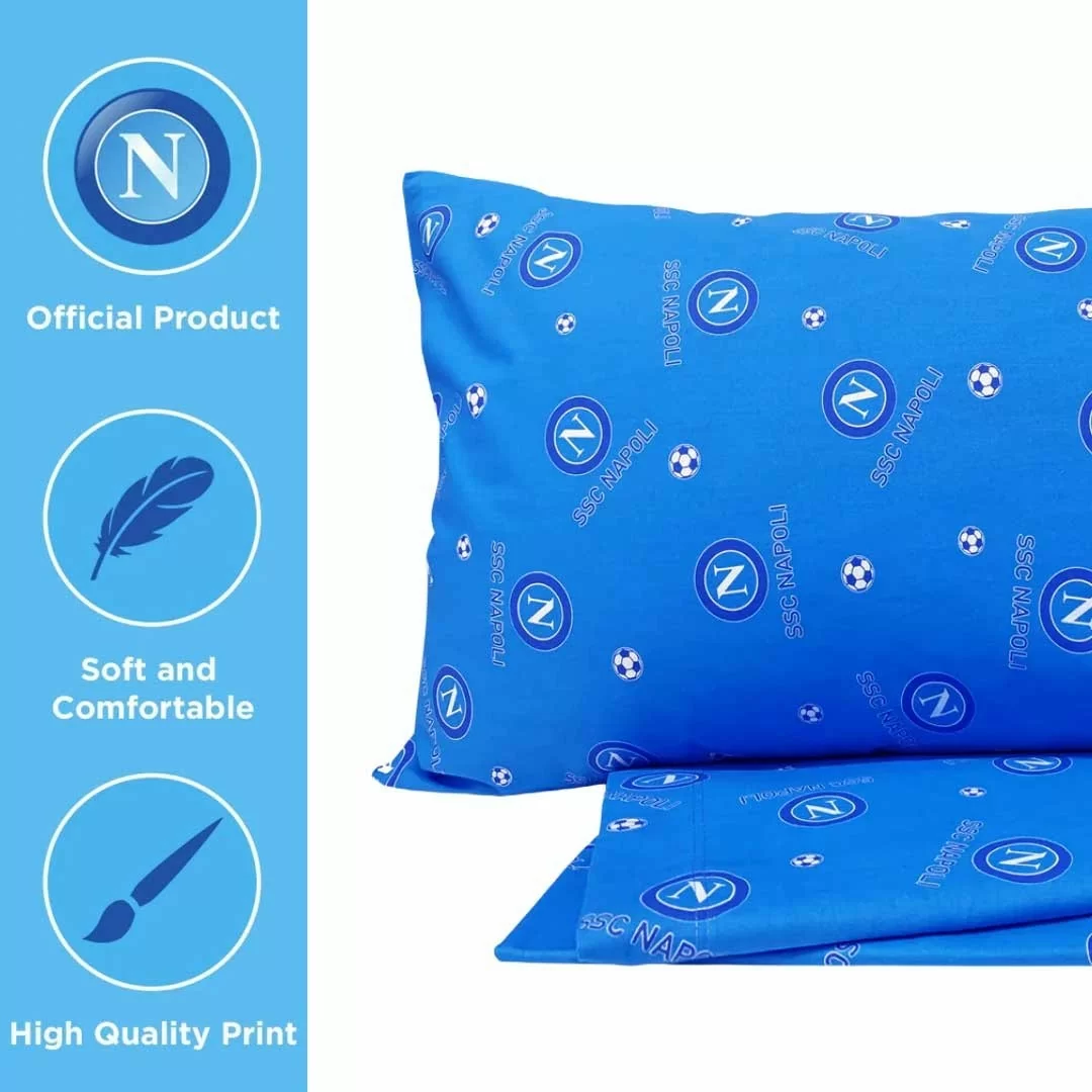 Porta la tua passione per la S.S.C. Napoli anche in camera da letto con questo splendido completo lenzuola singolo ufficiale! Perfetto per ogni vero tifoso, combina qualità, comfort e stile, permettendoti di vivere la magia azzurra ogni notte.
