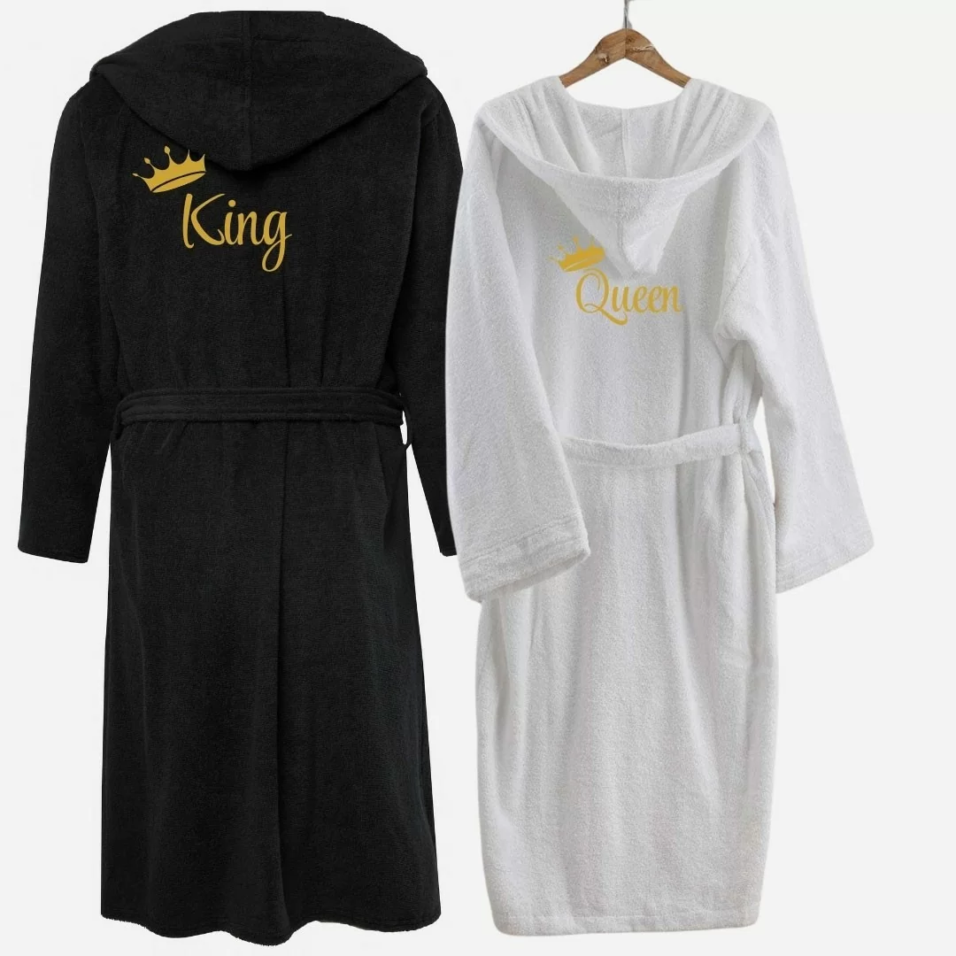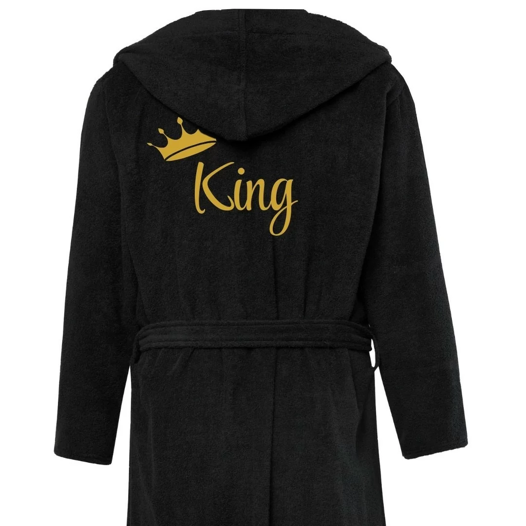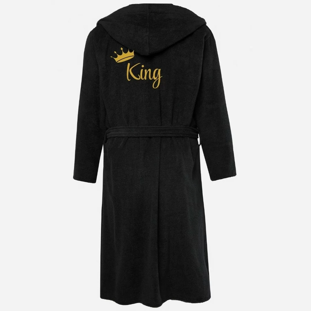 Per Lui: Accappatoio in spugna nero, con un raffinato ricamo "King" in colore oro. Ideale per l'uomo che desidera sentirsi regale e sicuro di sé anche nei momenti più intimi.