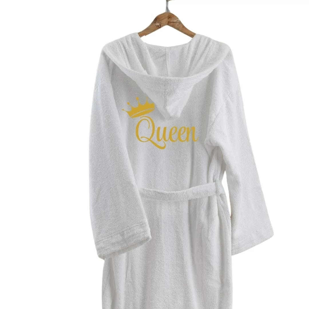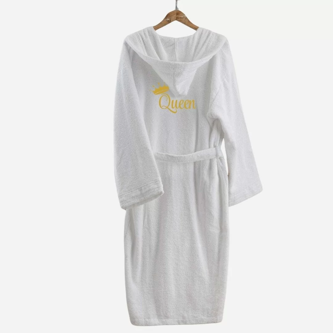 Per Lei: Accappatoio in spugna bianco, con il ricamo "Queen" in colore oro, che aggiunge un tocco di eleganza e femminilità, rendendo ogni attimo di relax un vero piacere.