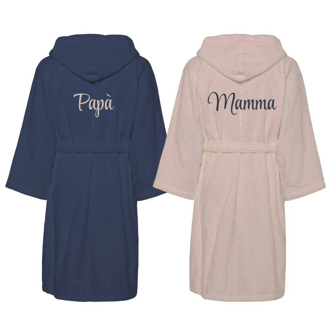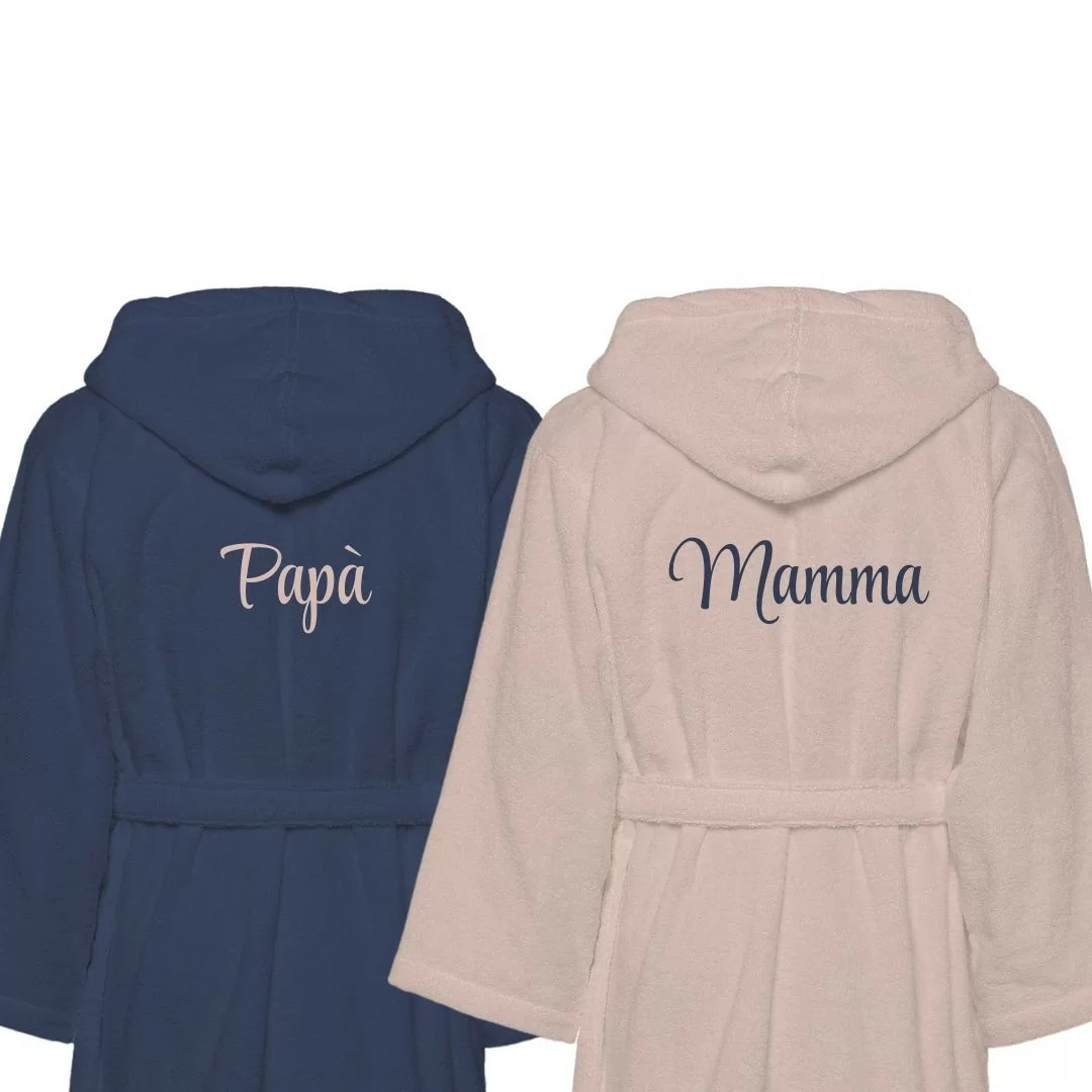 Il design bicolore dona un tocco moderno e sofisticato, mentre il ricamo personalizzato "Papà" e "Mamma" aggiunge un dettaglio affettuoso e distintivo, perfetto per celebrare l’amore quotidiano tra due persone speciali. Ogni accappatoio è dotato di cappuccio, cintura e tasche, per garantire praticità senza rinunciare allo stile.