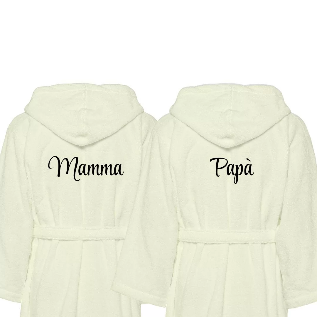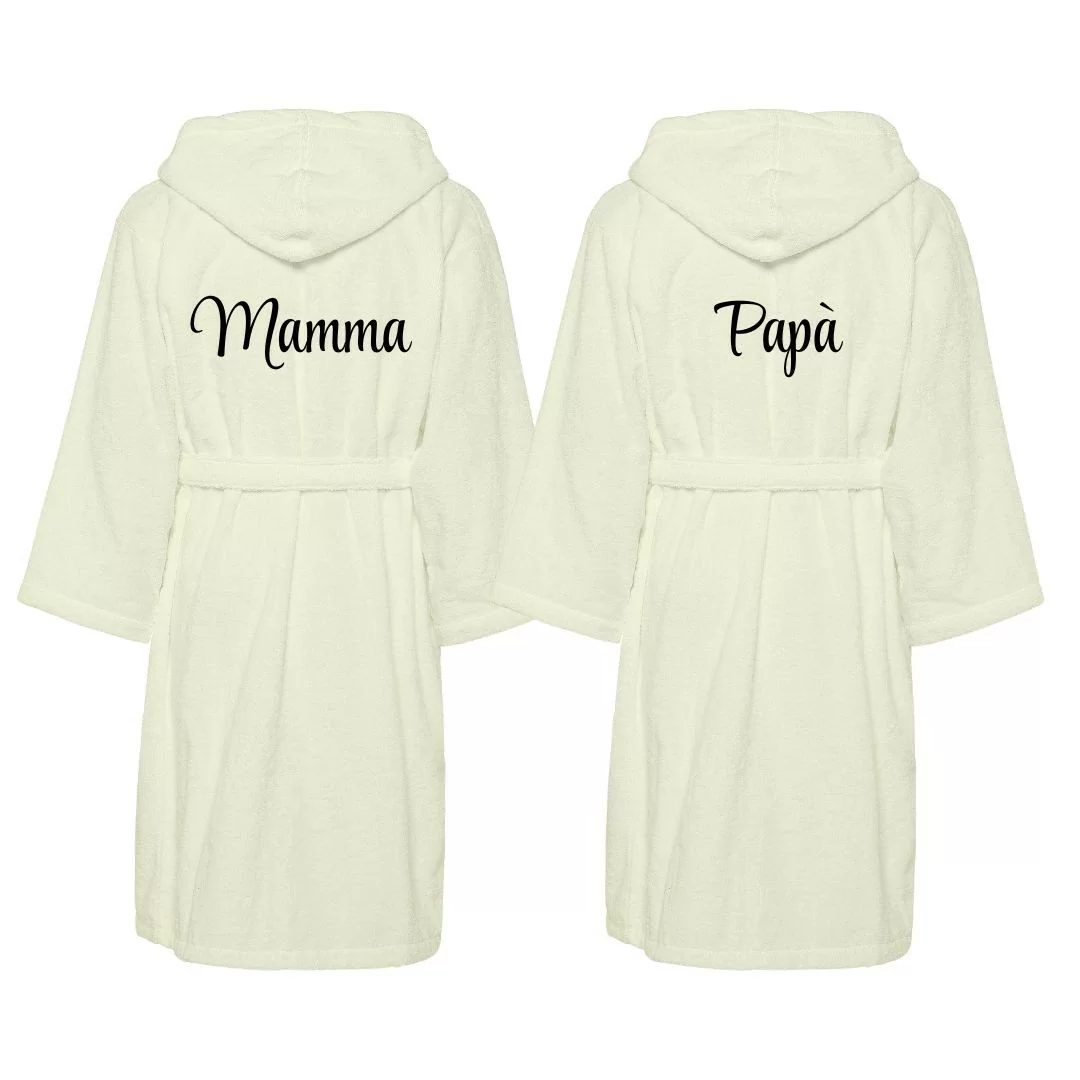 Set composto da 2 accappatoi: uno per Lui (“Papà”) e uno per Lei (“Mamma”)