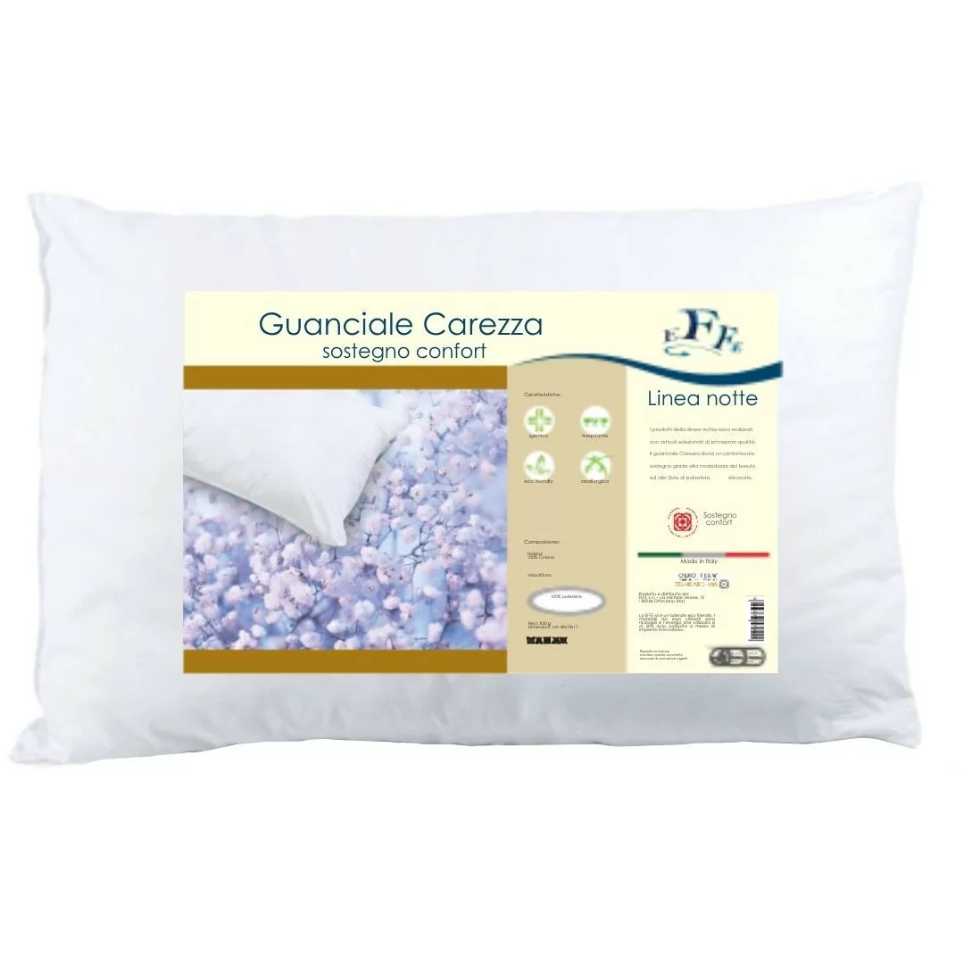 Guanciale Anallergico Effe art. Carezza. Il guanciale Carezza è realizzato in fibra anallergica cardata ed arrotolata. La qualità del materiale lo rende molto traspirante ed in grado di garantire nel tempo volume e sostegno. E’ disponibile in due misure: standard 50×80 cm