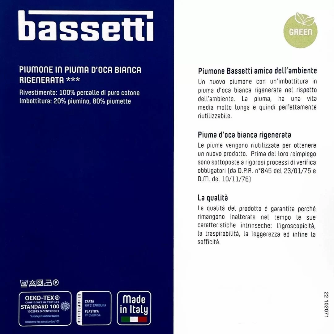 Ogni dettaglio è progettato per offrire un prodotto eccellente: cuciture accuratamente studiate per distribuire l’imbottitura in modo uniforme, materiali selezionati con cura e l’affidabilità del marchio Bassetti, sinonimo di qualità e tradizione nel settore tessile italiano.