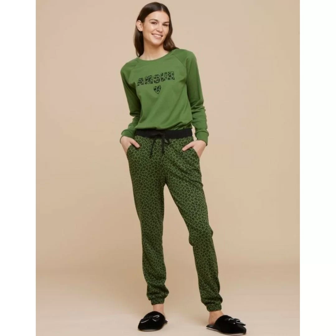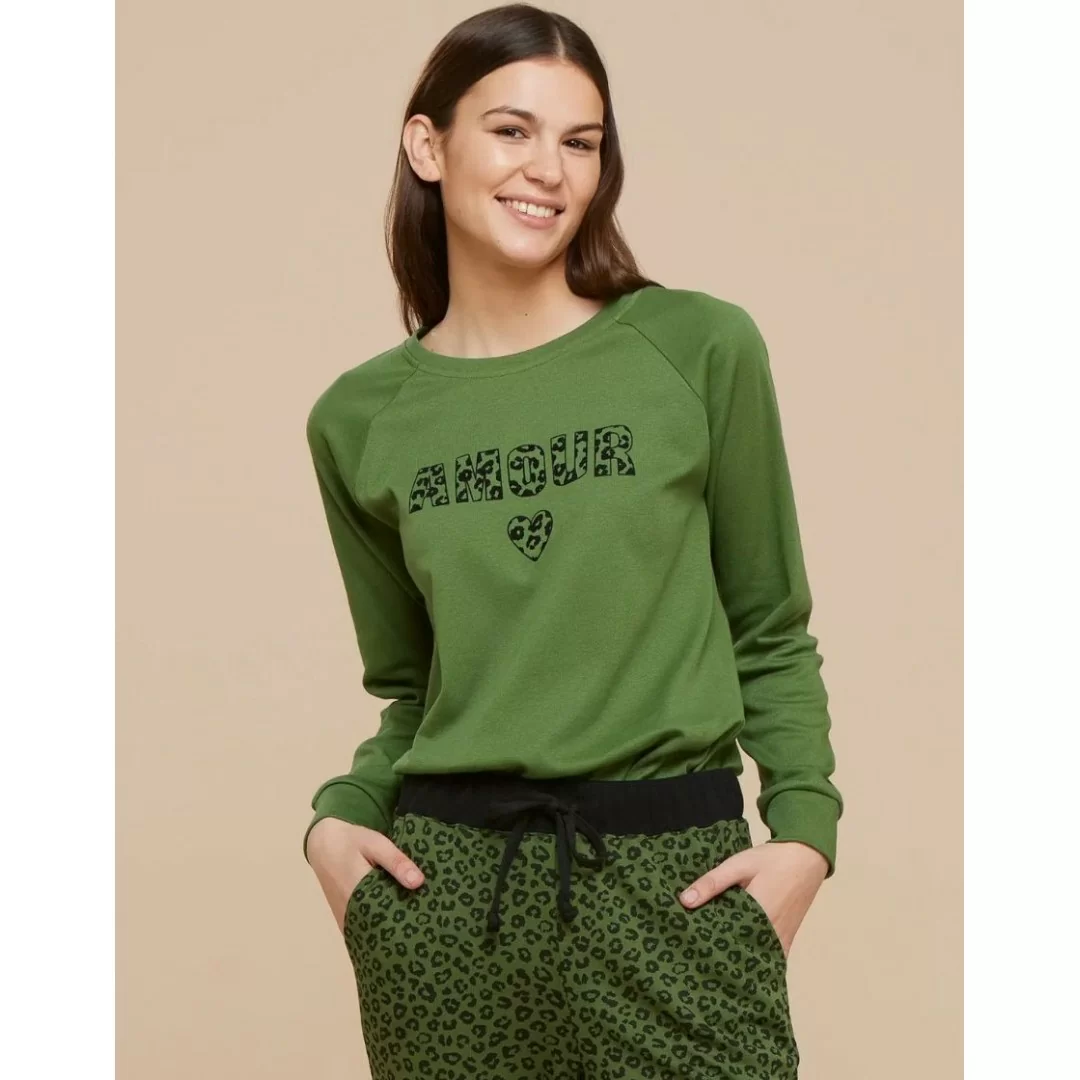 La maglia a maniche lunghe presenta un raffinato taglio raglan con polsini che garantiscono una vestibilità comoda e contemporanea. Il dettaglio che la rende davvero speciale è la stampa “amour” in fantasia leopardata, un elemento che conferisce femminilità e personalità al capo, perfetto per chi ama distinguersi anche nei momenti di relax.
