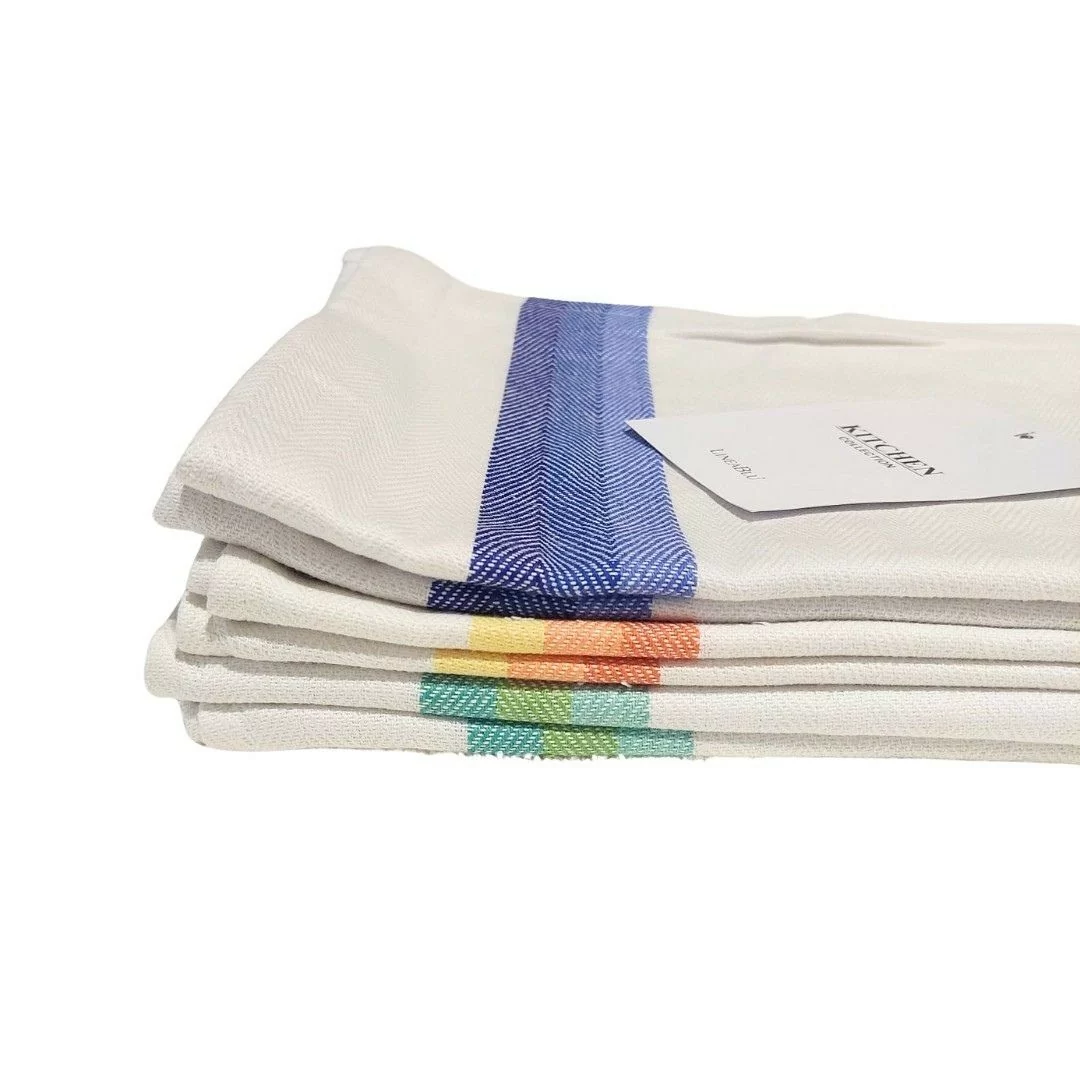 Strofinaccio Cucina LineaBlu art. Spigato 50x75cm Fasce Colorate set 12 pezzi. Strofinaccio 100% puro cotone ritorto di colore bianco è un prodotto eccezionale, caratterizzato da due fasce colorate laterali in colori assortiti, che non solo aggiungono un tocco di vivacità, ma offrono anche un'alta resistenza e una sofficità senza pari. La sua capacità di essere lavato ad alte temperature lo rende una scelta igienica e pratica per numerose applicazioni.